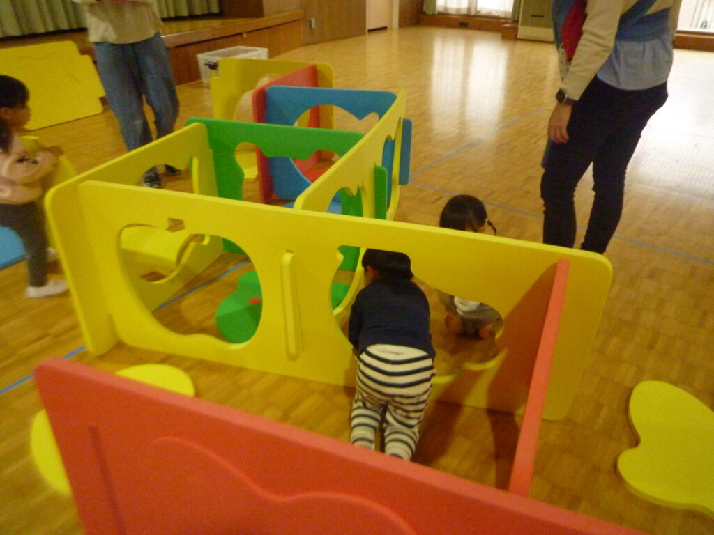 今回のぷちぴよぐる~ぷでは、室内でおままごと・粘土・ブロック・牛乳パックの手作り玩具を楽しむ子の姿が見られました。ホールではボール・型はめトンネル・手作りコースター・三輪車・段ボール電車を楽しんでいました。