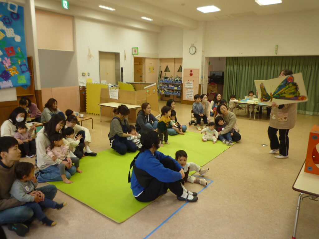 お楽しみタイムでは手遊び歌・大型絵本「はらぺこあおむし」を楽しみました。あおむしのお人形が出てくる所やお話の中の歌の部分も真剣な表情で見ている子や歌に合わせて揺れている姿が印象的でした。また色々な手遊び歌やお話を楽しみましょうね♪