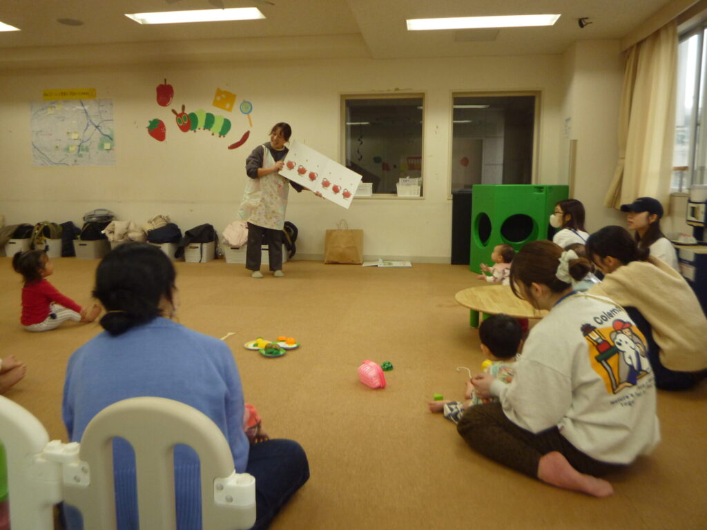 0~6歳過ぎの親子の皆様と一緒に過ごすことが出来ました。手遊び歌をはじめ大型絵本やパネルシアター、パラバルーンなどを楽しめました。中でも大型絵本の“だるまさんが”・“ぴょーん”は大人気で絵本の内容に合わせて身体を動かしているような姿も見られました。0歳児のお子さんもジーっと絵本やおともだちの様子を見ることで雰囲気を感じているのではないかと思いました。