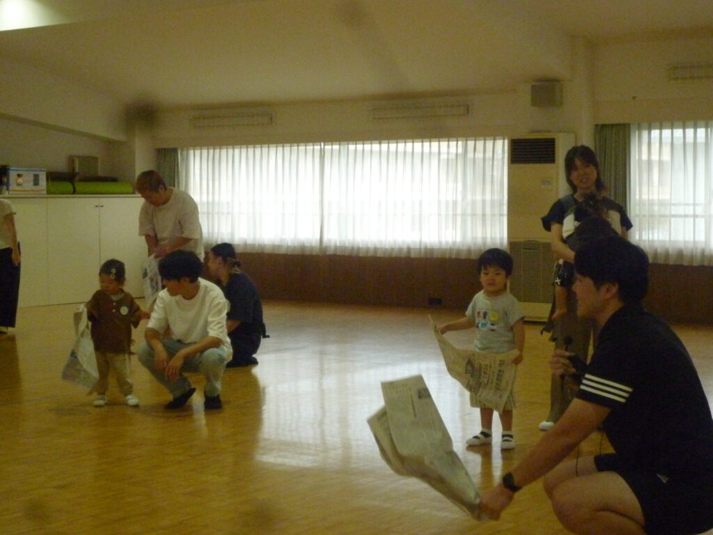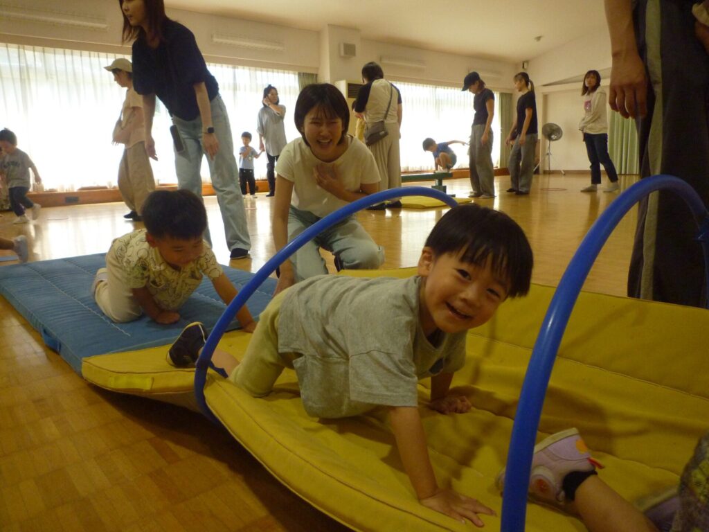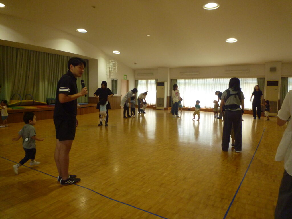 今回は聖ヶ丘保育専門学校から小貫先生(通称:ぬっき~先生)と親子で行う体操体験を実施しました。子ども達はいつもいない先生に少し緊張しているような姿もありましたが、親子でできる体操を教えてもらい徐々に打ち解けていきました。保護者の方にも丁寧に分かりやすく、この身体の動きはどんなところに効果があるなど伝えてくれました!お家でも真似しやすいものばかりで