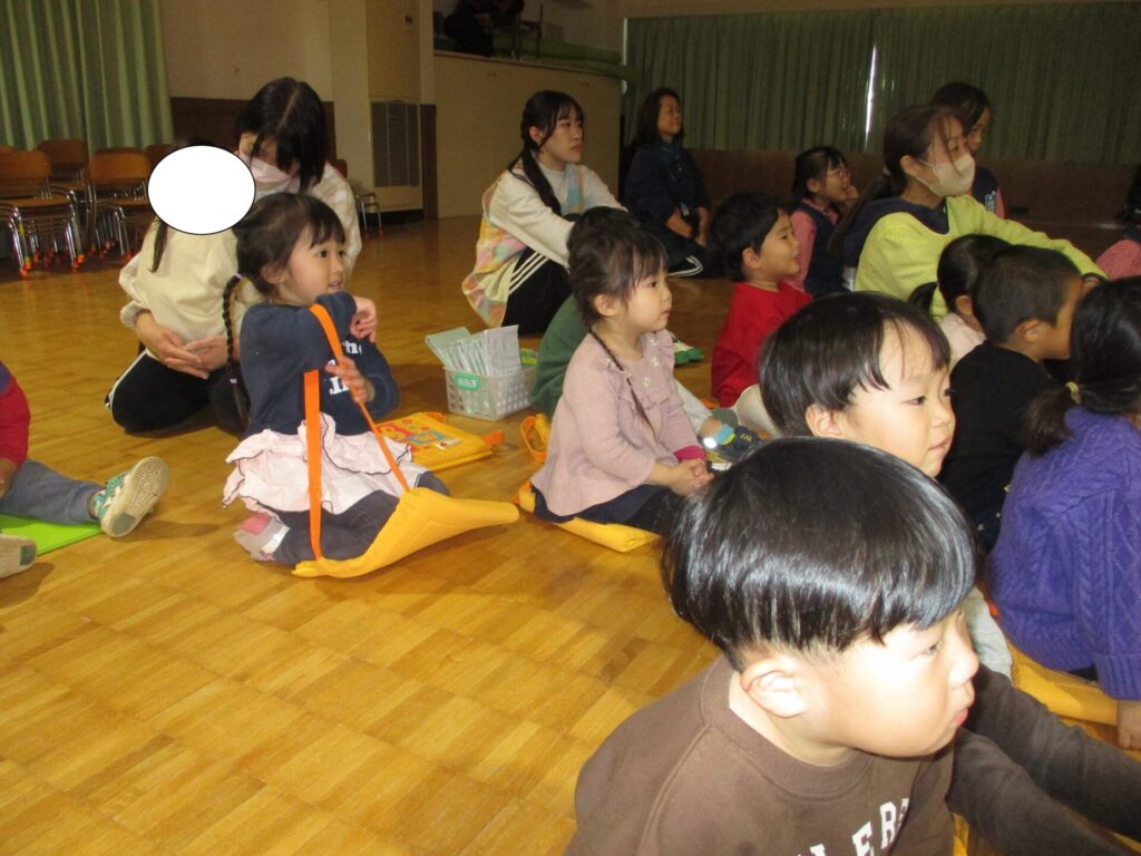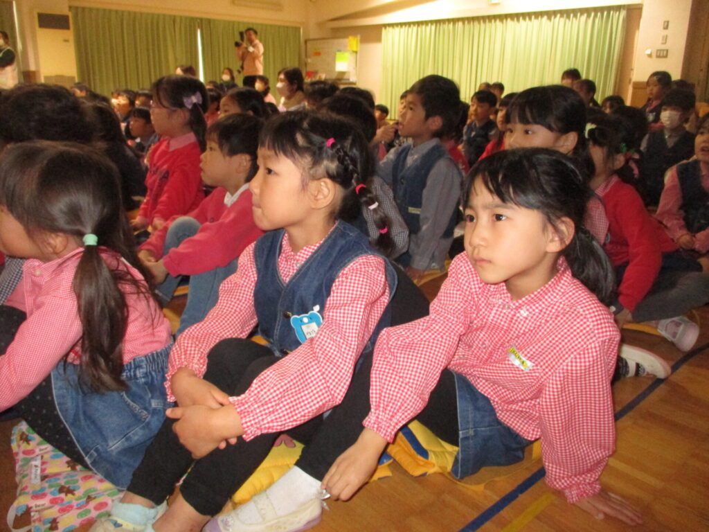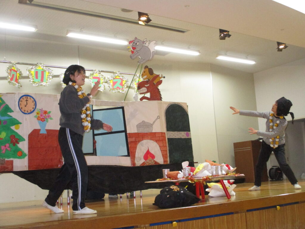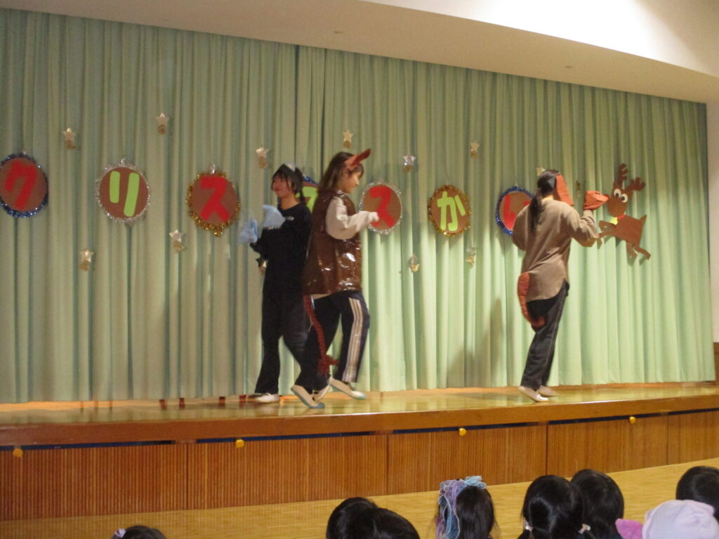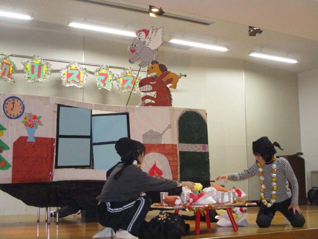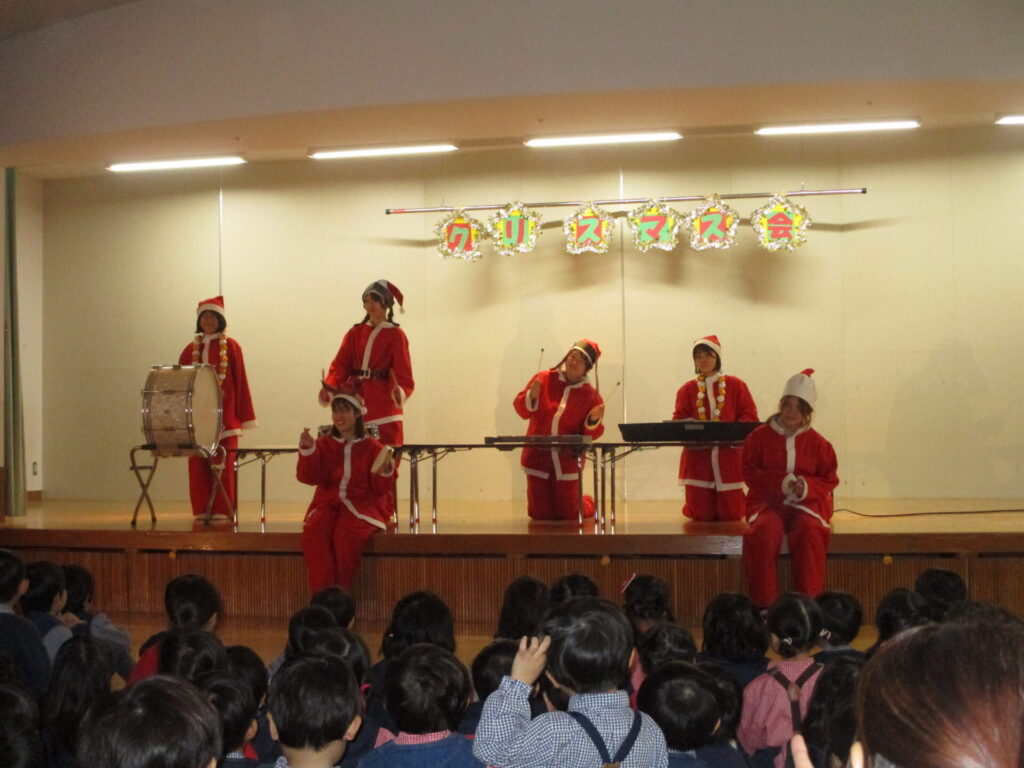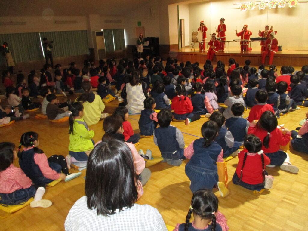 今日はこども園になり、初のクリスマス会。1,2歳児の子どもたちもホールへ移動し、幼児の子どもたちと合流。まずは先生たちの劇「ブレーメンの音楽隊」を観ました。
