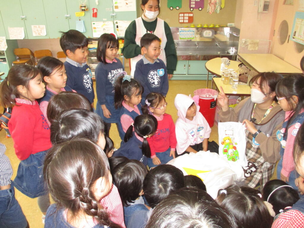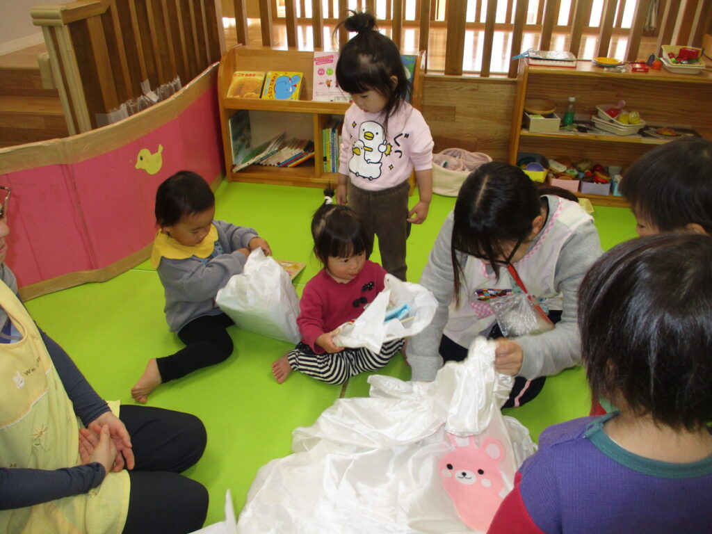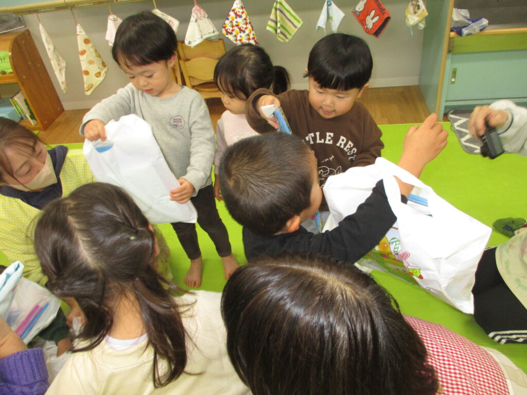 そして保育室に戻ると、そこにはプレゼントが・・・「きっと絵本じゃない?!」という声も聞かれましたが、袋の中から出てきたものは全く違うものが。「わ~!!凄い!!」と大喜び。