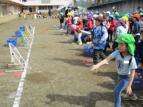 年長さんはボールを投げる、打つことをゲームのようにして体験しました。