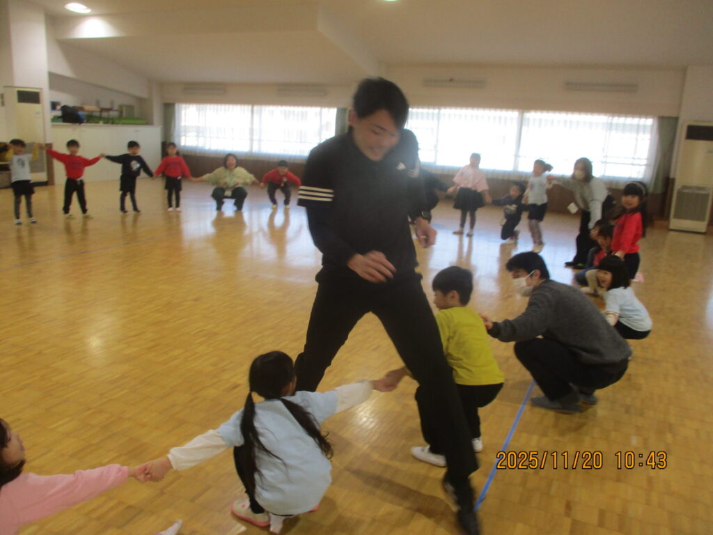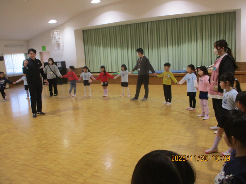 「らいおんゲーム」(みんなで手をつなぎ輪になり、中にいるライオン役のぬっきー先生を外に出さないようにするゲーム)を楽しみました。本日ご来園頂いている保護者の皆様もご参加いただきありがとうございました。