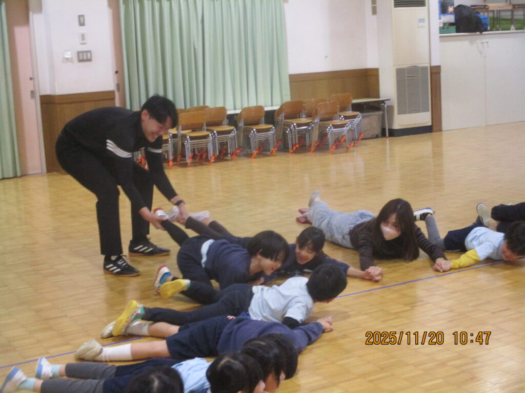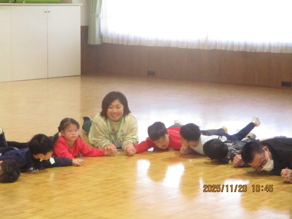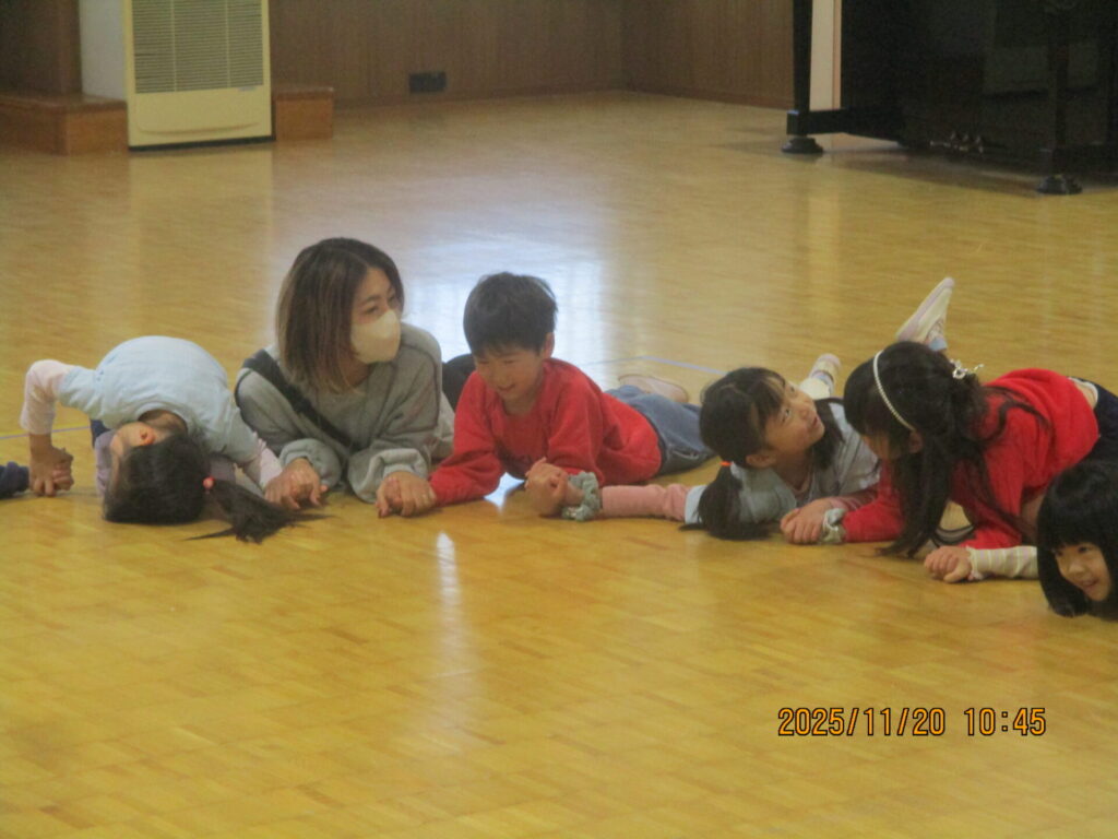 そして「ダイコン抜きゲーム」(床にペタっと脚を伸ばして寝転がり、ぬっきー先生に脚をひっぱられないように踏ん張るゲーム)