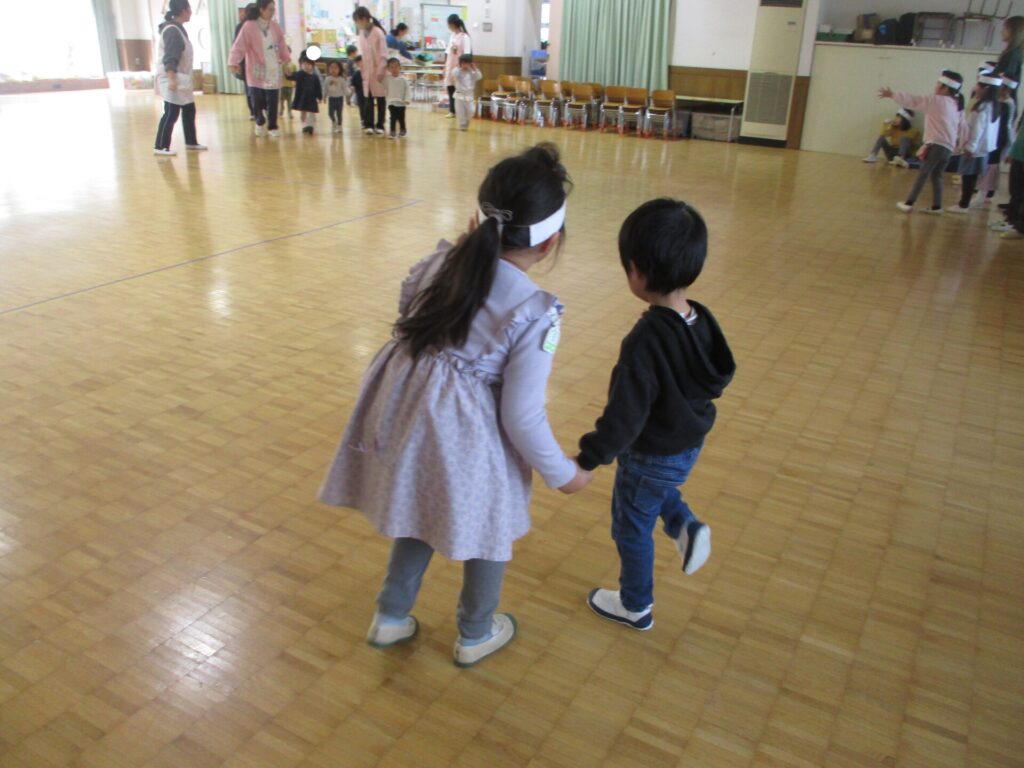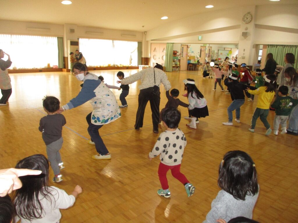 その後ひよこのお友達とひかり組さんみ~んなで、「だるまさんころんだ!」を楽しみました。「手をつないで、いっしょに行くからついてきてね!」等やさしく未就園児に話しかける子どもの姿もみられました。そして始まる直前には在園児の3号(2歳児クラス)いるか組さんも参加。