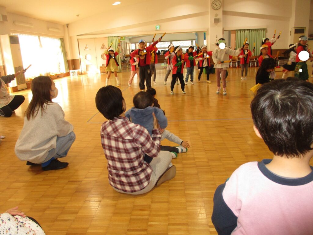その後はみんなで運動会で行った年長組のダンスを披露。するといるか組の子どもたちも自信満々に「最初のポーズ」