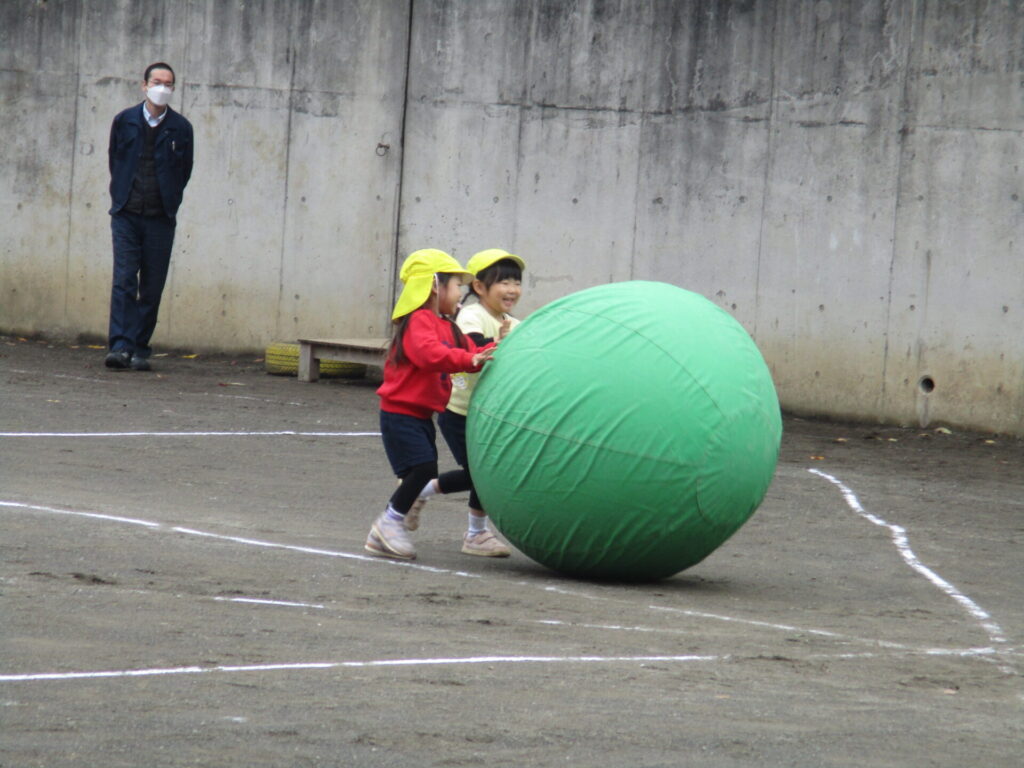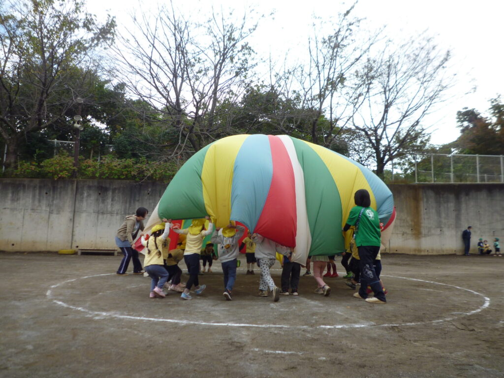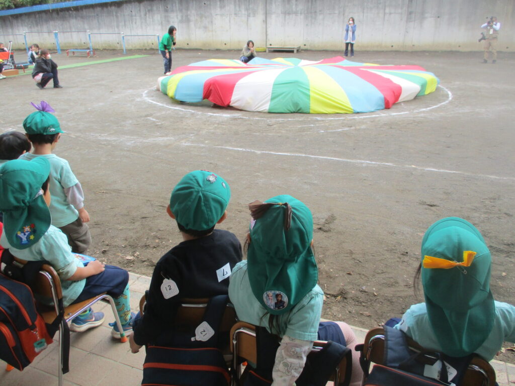 年中組はうめ組だけでしたが、パラバルーンと親子競技の大玉転がしを行いました。パラバルーンを年少さんが見ています。来年はみんなの出番だからね! ペチャンコなおせんべいと風船も無事膨らみました。