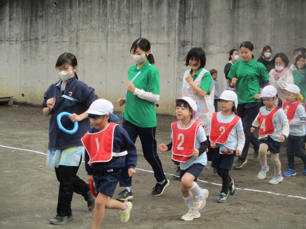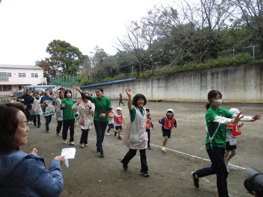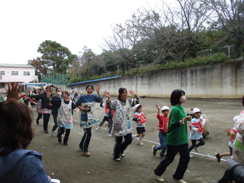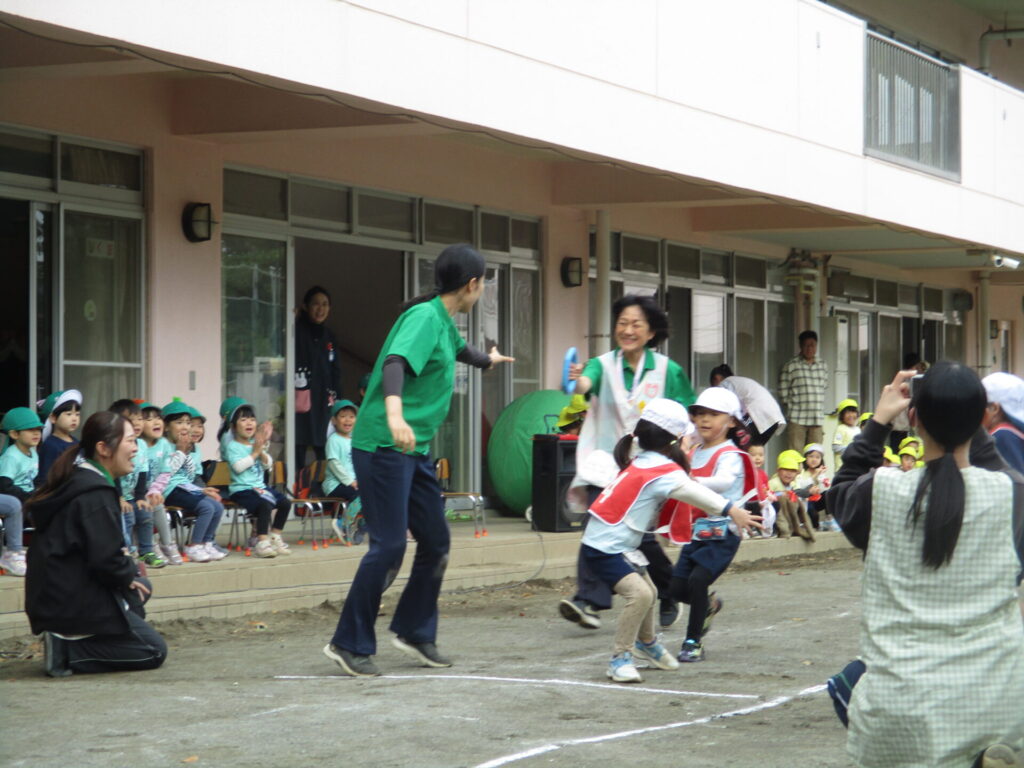 そしてリレー・・・ここまでになかなかほし組に勝てずにいたひかり組。しかし今日はそのほし組がいない状況で、どうしようか?と思っているところに、なんと!!育和幼稚園の先生たちが参上。幼児組の先生をはじめ乳児組の先生や預かり保育の先生、フリーの先生等、勢ぞろい。