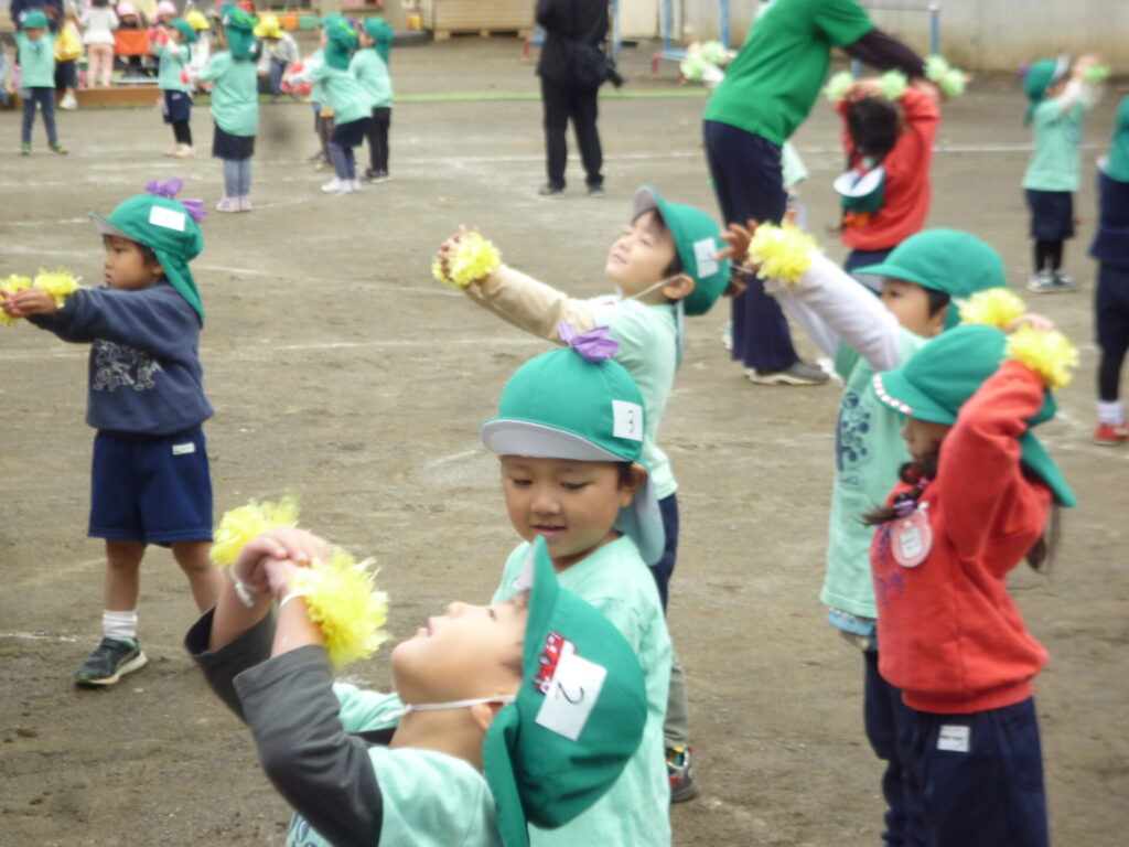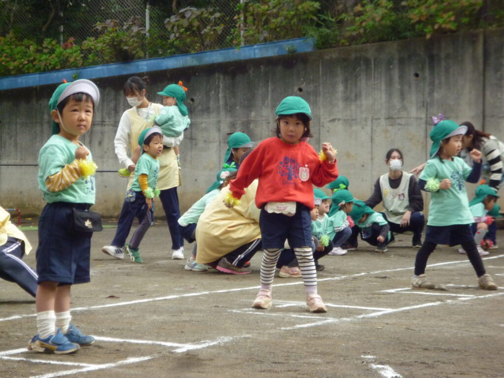そして年長組はひかり組がダンスとリレーをやりました・・・といえど、ひかり組1クラスのみ。でもダンスを踊っていると2歳児クラスのいるか組の子どもたちや年少組さんも、子どもたちみんなが憧れの存在のようにして一緒にダンスを踊る姿がみられました。いるか組の子どもが持っている旗は担任の手作りです。